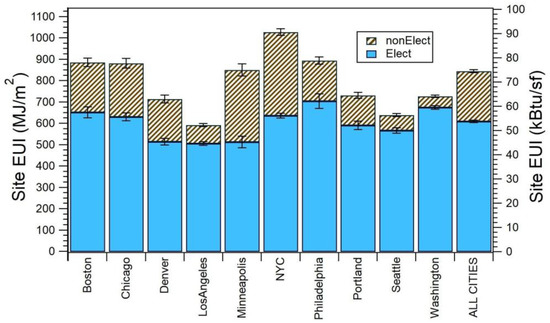 Area-weighted mean site energy use intensity (EUI) for offices in ten cities and in aggregate (ALL CITIES). Electric EUI contribution is shown in blue and non-electric in brown. Error bars represent bootstrap standard deviations of means.