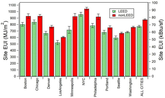 Area-weighted mean site EUI for LEED (Leadership in Energy and Environmental Design) offices in green and non-LEED offices in red, in ten cities and in aggregate (ALL CITIES). Error bars represent bootstrap standard deviations of weighted means.