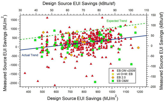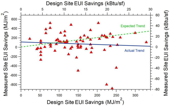 Roughly a quarter of the 861 LEED buildings identified in the benchmarking data were certified under a LEED system such as NC or CS, for which points for energy optimization were awarded on the basis of projected site energy savings. We were able to obtain the EAc1 parameters for 75 such offices from their LEED scorecards posted on the Green Information Building Gateway [29]. Using the method described in Section 2.5, these were used to impute projected site EUI savings for each of these offices. The projected site EUI savings for 72 of these were then compared with the measured savings based on mean EUI for non-LEED offices in each city (summarized in Table 1). Figure 4 is a graph of the measured site EUI savings (δSiteEUIj) versus the projected site EUI savings for each of these LEED buildings. If the measured savings agree with the projected savings, the graph is expected to be a straight line of slope unity, shown as the dashed green line in the figure. Instead, Figure 4 demonstrates negligible correlation between the projected and measured site EUI savings. A linear least squares fit to the data in Figure 4 yields a line with slope −0.16 with an R2 of 0.0025. The p-value is 0.67, confirming that design projections are not a significant predictor of measured savings. The total measured site energy savings for these 74 LEED offices is 11% below their total predicted site energy savings.