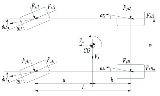 where , are the longitudinal and lateral velocities; is the yaw rate of the vehicle; and are longitudinal acceleration and lateral acceleration, respectively; and are longitudinal and lateral forces of the four wheels, respectively, where is 11, 12, 21, and 22, which represent the front left, front right, rear left, and rear right wheel, respectively. represents the yaw moment of the vehicle; m is the vehicle mass; w is the track width; a and b are the distances from the gravity center to the front and the rear axles, respectively; L is the wheelbase; is the moment of inertia of the vehicle around the axis; and and are the steering angles of the left and right front wheels, respectively.
