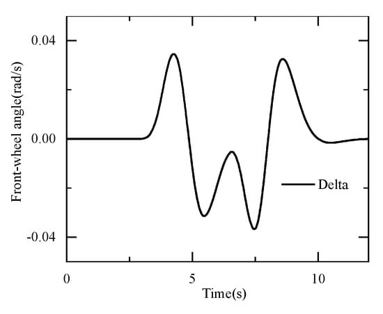 To evaluate the observation effect of the HRUKF observer on the vehicle state parameters, the steering condition was adopted as the double-lane change condition with more intense driving; the vehicle front wheel angle is shown in Figure 3. The wheel angle and the angular velocity of four wheels were taken as the inputs of the observer system, and the simulation results of the corresponding UKF algorithm and HRUKF algorithm were compared, as shown in Figure 4 and Figure 5.