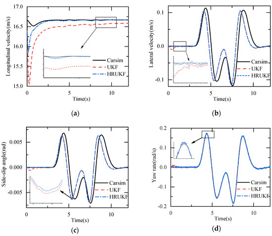 It can be seen from the observations of longitudinal and lateral velocity, yaw rate, and sideslip angle that HRUKF can closely approximate the true value of the state output by Carsim, and HRUKF does not show large deviations in the entire double-lane change simulation. In the observations of lateral velocity, yaw, and vehicle sideslip angle, a discrete increase in the error occurred at 0–1 s. HRUKF suppressed the influence of this error, and the algorithm showed good robustness. The measurement noise of the UKF algorithm is initially set at a fixed value and cannot be updated in real-time, so the traditional UKF is less resistant to noise than the HRUKF algorithm. The reason for the error of the lateral velocity and the vehicle sideslip angle compared with Carsim is that the vehicle mathematical model is simplified compared with the simulated dynamics model, ignoring the influence of the suspension on the vehicle motion state and not considering the influence of the roll on the whole vehicle. Furthermore, the vehicle steering angle is larger under the high-speed operating conditions of the double-lane change, and there is load transfer, and the suspension has an important role in resisting load transfer. Therefore, the simplified model leads to the error of simulation results, and the accuracy of tire modeling also has an impact on the result.