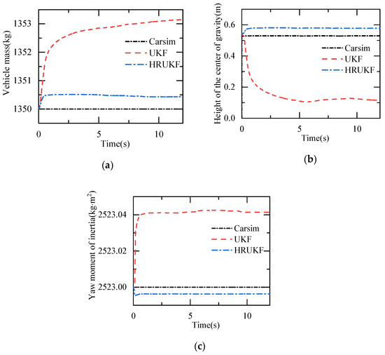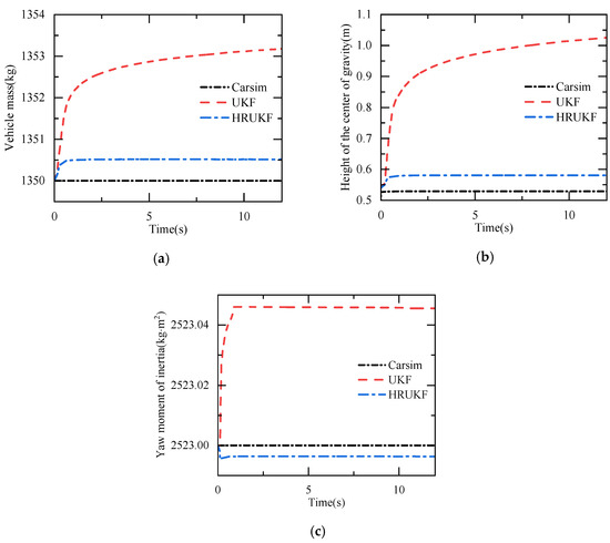 As shown in Figure 7, the vehicle mass observation result of the UKF algorithm gradually shifts the real value under the uniform linear driving condition. By comparison, the HRUKF algorithm converges to near the real value in about 0.5 s, and the absolute error value is about 0.5 kg, which is the same as that under the double-lane change condition. In addition, the height of the center of gravity and the yaw moment inertia observations show that the HRUKF algorithm still suppresses the outliers better with the same initial values, whereas the UKF algorithm is affected by the outlier divergence. This is particularly obvious in the height of the center of gravity observations. The results show that the Huber cost function can suppress the errors well, and HRUKF has better robustness. Similarly, to quantitatively analyze the estimation effects of the two algorithms, the RMSE indicator was used for evaluation, and the results are shown in Table 3.