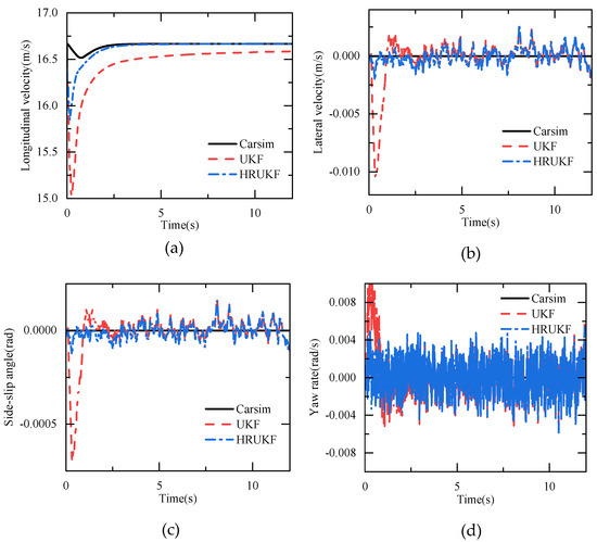 As shown in Figure 6, both the UKF and HRUKF algorithms experienced errors relative to the real value of the Carsim output at the beginning of the simulation in the straight-line driving condition at constant speed. However, the HRUKF had a smaller error than the UKF and converged quickly to the real value of the Carsim output in about 2.5 s, whereas the UKF algorithm converged to a certain error relative to the real value. Thus, the HRUKF algorithm can better reflect the real longitudinal speed of the vehicle under this working condition. The observation results of lateral velocity, vehicle sideslip angle, and yaw rate show that the three values of Carsim output are constant at 0 because of the uniform linear driving condition. The UKF and HRUKF incurred errors due to the influence of observation noise, and the UKF algorithm generated more errors than the HRUKF algorithm in the first 0–1 s of operation. The maximum error was more than 200%, and the HRUKF observer showed better robustness because the Huber cost function suppresses the errors generated by noise.