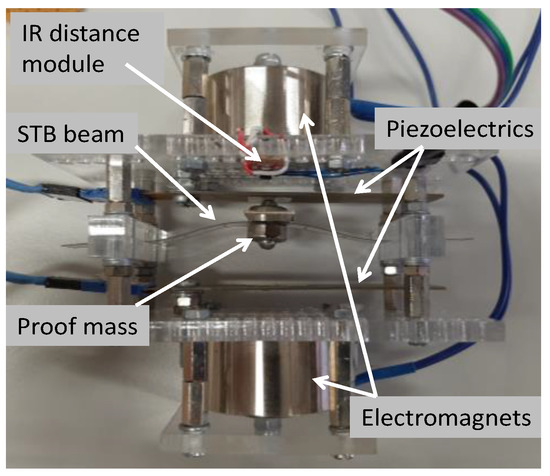 An InfraRed (IR) distance module, Pololu QTR-1A, has been used during the investigation of the device behavior to observe the beam deflection and the number of switching events in a fixed time interval. To investigate the device behavior as a function of the input signal (deterministic and stochastic) characteristics, an electromagnetic shaking system was used. The shaker uses two electromagnets WF-P34/18, shown in Figure 2, driven by counter phase current signals. The shaker generates a magnetic force on the proof mass thus miming the target vibrations. To this aim, the proof mass consists of a permanent magnet. It is important to note that the electromagnetic shaker is not part of the sensor/EH system but is a tool used only for the sake of the device characterization.