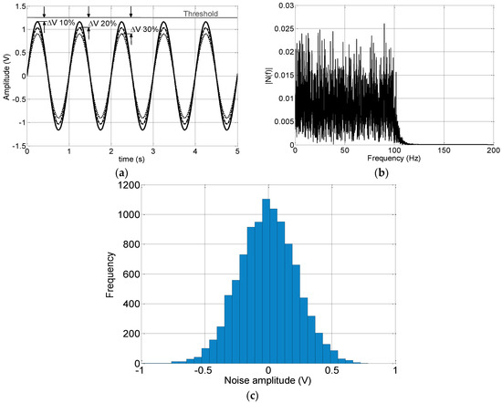 In particular, Figure 4a,c,e shows the subthreshold sinusoidal input at 1 Hz with an amplitude of 0.903 V corresponding to the case of ∆V = 30% and three different levels of superimposed noise, with a standard deviation, σn, of 0.12, 0.24, and 0.56 V, respectively.