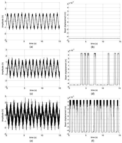 The related beam displacement between the two stable states (observed by the IR distance sensor) is reported in Figure 4b,d,f. As it easily emerges, the first noise level (σn = 0.12 V) is not sufficient to fill the gap ∆V defined in (1) and overpass the beam switching threshold Sth thus activating the beam switching. In fact, as shown in Figure 4b, the beam remains in one of its stable states (specifically at −4.5 mm in the case reported in the figure).