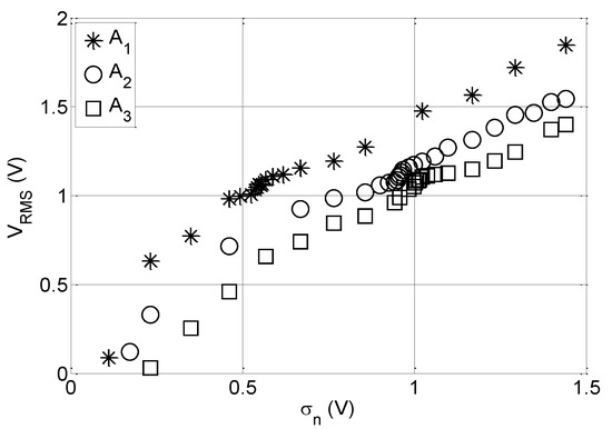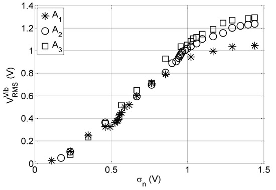 Just as a reference example, Figure 5 shows the observed piezoelectric RMS output voltage, VRMS, as a function of the superimposed noise level (σn is the standard deviation of the noise signal) in the case of the three amplitudes of the subthreshold sinusoidal input at 1 Hz. The VRMS is calculated as the sum of the RMS voltages from the two piezoelectric transducers. Clearly, the RMS value of the output voltage increases with the noise level. Moreover, as expected, for a fixed noise level, the output voltage increases while decreasing the gap ΔV or, equivalently, increasing the amplitude of the deterministic component. Furthermore, as it can be observed, for fixed VRMS, the vibration level σn cannot be univocally defined, since it depends on the amplitude of the deterministic input.