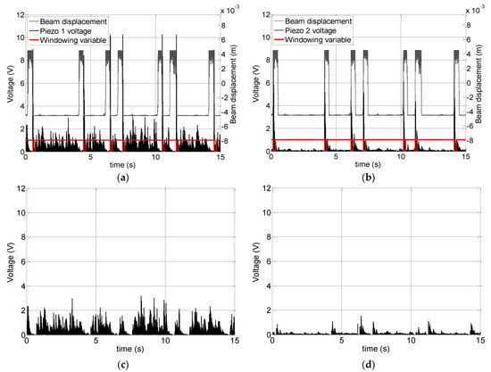 For the sake of the algorithm explanation, it is convenient to refer to Figure 7a,b, which shows the two observed output voltage signals from the two piezoelectric transducers and the beam displacement in the case of a subthreshold sinusoidal input at 1 Hz, with an amplitude of 30% lower than the beam switching threshold and a superimposed noisy vibration with = 0.47 V.