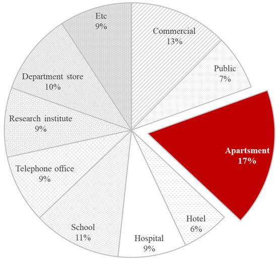 Energy consumption in buildings in Korea stems mostly from energy use in apartment buildings, hospitals, schools, and commercial buildings (see Figure 1) [4]. Among them, the energy consumption of apartments is about 17.0%, accounting for the largest percentage. Therefore, energy saving and efficient energy usage in relation to apartment housings will have a significant influence on energy maintenance throughout the country. In particular, about 67.1% of the energy consumed in apartment housings in Korea is used for heating, so it is required to focus on heating energy reduction [5]. Therefore, the use of high-efficiency systems that can save energy (district heating systems, geothermal heat pumps, high-efficiency boilers, etc.) is increasing. However, the performance of these heating systems can be maximized only when optimal system operation and control are involved. In general, to operate the systems at an appropriate and optimal level, it is essential to predict and evaluate the heating load that a heating system must handle. If a demand for the heating loads is identified in advance and an optimal system operation for the heating loads is planned, it is possible to prevent overheating and to save energy. Furthermore, the system operation plan based on the identified heating loads may enhance thermal satisfaction in indoor spaces. Therefore, it is necessary for the technology on predicting heating loads to minimize over/under heating usages and to maintain a comfortable indoor space environment.