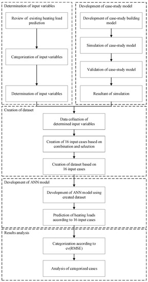 This study evaluated the influence of input variables on the ANN model when predicting a heating load and analyzed the predicted heating load. Figure 2 shows the overall flowchart of this research.