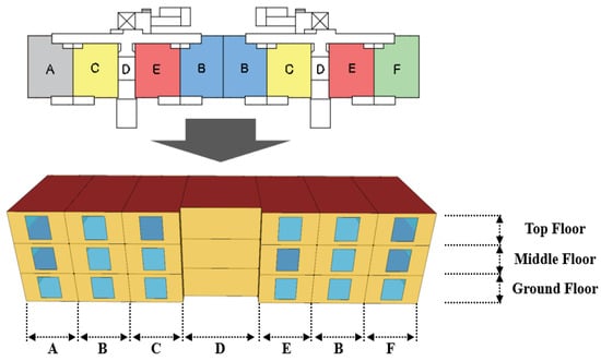 EnergyPlus was used to develop a case-study model that reflects the characteristics of apartment A. The produced model consists of the ground floor, middle floor, and top floor to reflect the load characteristics of low, middle, and high floors of an apartment housing by varying the thermal boundary conditions of the floors and ceilings of each three floors. The remaining simulation conditions were produced based on apartment A. Table 3 shows the simulation parameters. Figure 3 shows the zone configuration of the actual apartment building and the shape of the case-study model.