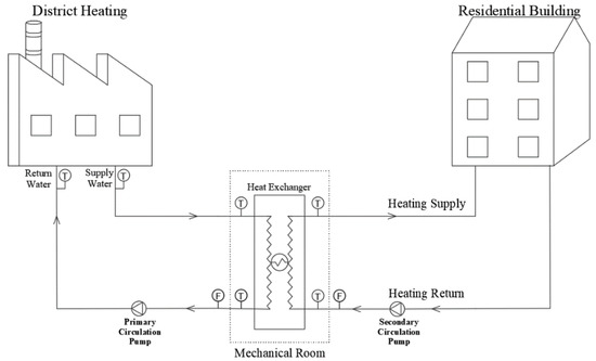 In the case-study simulation, district heating was used as a heat source. In general, a heating system using district heating as a heat source that consists of a primary side loop that supplies water from the heat source production site to the machine room of an apartment housing and a secondary side loop that sends water from the machine room of the apartment housing to households (Figure 5). Since this study was conducted for apartment buildings, the system data of the secondary side loop connected to an apartment housing was used. Accordingly, the supply water temperature, mass flow rate, and return water temperature were used as system data.