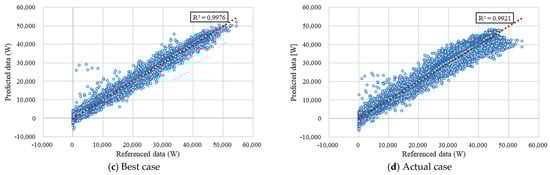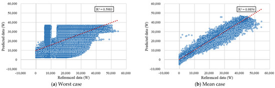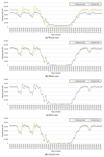 Figure 7 shows the comparison results between the predicted data and referenced data of each case over time, where SWT is 52 °C and is 0.55 kg/s. These are the predicted results on 13 January. The prediction results of the worst case were inaccurate in general. The predicted data changes according to the large change trend of the referenced data, but the value difference was inaccurate at an average of about 2610 W. In addition, it did not reflect the fluctuation of a load that changes in a short period of time. Therefore, it is unlikely that the prediction results of the worst case will be reliable.