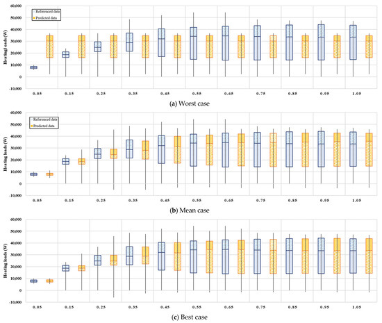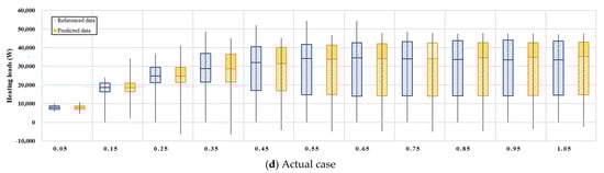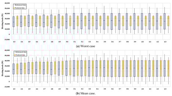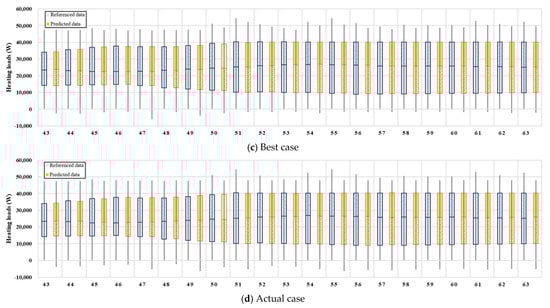 The ANN model developed in this study was designed to predict a heating load when the SWT was controlled between 43 °C and 63 °C. Therefore, the heating prediction value and referenced data of each case were analyzed according to SWT using a box plot (see Figure 8). As a result, the range of the predicted heating load value in the worst case was similar to the referenced data based on the data between 25% and 75% in the range of 43 to 45 °C and the value was different from the reference data in other temperature ranges. However, the prediction accuracy was the lowest based on cv(RMSE) when the SWT was 43 °C. In the mean case, the prediction performance was the best at 48 °C and it was the lowest at 63 °C. In the best case, the prediction performance was the best at 47 °C and the cv(RMSE) was about 2.41%. The SWT with the lowest prediction performance in the best case was 63 °C. In the actual case, the prediction performance was the best with a cv(RMSE) value of about 4.15% at 45 °C. The prediction accuracy was the lowest at 63 °C in the actual case.