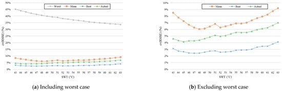 Figure 9 is the result of cv(RMSE) analysis by temperature of each case. In the worst case, cv(RMSE) decreased as SWT increased. In the mean case and best case, cv(RMSE) decreased as SWT increased from 43 to 48 °C. However, when the temperature increased from 48 to 63 °C, cv(RMSE) decreased. In the actual case, when SWT increased, cv(RMSE) decreased to 45 °C, and cv(RMSE) increased as the temperature increased in other sections.