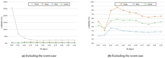 Figure 10 is a box plot of the heating load distribution predicted at intervals of 0.1 kg/s for the mass flow rate ranging from 0.05 to 1.05 kg/s. The worst case did not respond to the change in the flow rate and the change of the predicted heating load was insignificant when the flow rate changed from 0.05 to 1.05 kg/s. Here, it was impossible to predict the heating load because the cv(RMSE) was about 256.2% when the flow rate was 0.05 kg/s. In the mean case, the prediction accuracy was the lowest with a cv(RMSE) value of about 8.7% at 0.35 kg/s and the prediction accuracy was the highest with cv(RMSE) of 3.1% at 0.15 kg/s. The cv(RMSE) for each flow rate in the best case was a minimum of 1.7% to a maximum of 3.7%. The prediction accuracy of the actual case was from a minimum of 3.7% to a maximum of 5.8% based on cv(RMSE), the prediction accuracy regarding which was about 2% lower than the best case. In addition, the minimum cv(RMSE) was 0.6% higher than the mean case but about 3% lower than the maximum value.