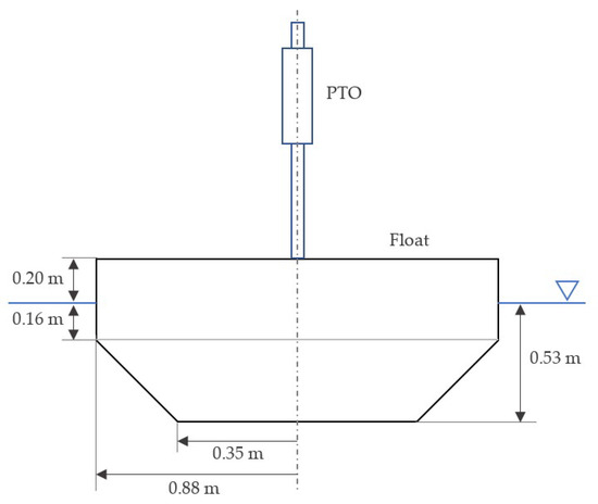 The WEC device studied here is a roughly 1/17th-scale model designed by Sandia National Laboratories [55]. It is schematically depicted in Figure 1 and its most relevant physical parameters are summarized in Table 1. This device was designed to work in three degrees-of-freedom: heave, surge and pitch. However, for cases considered in this study, the surge and pitch motions are locked and the device is allowed to move in heave only. During the experiments, the effect of the PTO system is reproduced by means of an actuator located on top of the float, as shown in Figure 1. Therefore, the total rigid-body mass is the sum of the masses of the float and the actuator slider, as noted in Table 1. The vertical position of the float is measured by the sinusoidal encoder of the actuator, while the vertical force is measured by load cells. More information about the experimental data acquisition can be found in [55,56,57].