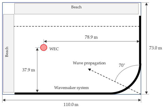 Physical tests were conducted in the Maneuvering and Sea Keeping (MASK) basin located in the Naval Surface Warfare Center, Carderock Division. As shown in Figure 2, the MASK basin is 110 m long, 73 m wide and 6.1 m deep, except for a 15.2 m wide trench parallel to the long side of the basin (dashed line), which has a depth of 10.7 m. Waves were sent diagonally across the basin. The MASK basin is spanned by a 115 m bridge (not shown in Figure 2 for the sake of simplicity), which can move, thanks to a rail system, to the center of the basin width as well as rotate up to 45° from the centerline. The MASK basin carriage, where the models and instrumentation are mounted, is suspended beneath the bridge, and is permitted to travel along the rails. The basin is equipped with a wavemaker system consisting of 216 paddles: 108 paddles along the long side of the basin, 60 paddles in a ninety-degree arc, and 48 paddles along the short edge of the basin. Two artificial beaches, with a 12° slope, are used to avoid wave reflections from the two edges opposite to the wavemakers. Note that the numerical tanks that will be used for the simulations in the next sections aim to reproduce the same wave–WEC interactions as in the wave basin (Figure 2). Several reductions in the tank dimensions were applied to reduce the computational runtime, however, due to the geometry of the float, it is necessary to keep all the simulations in 3D.