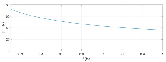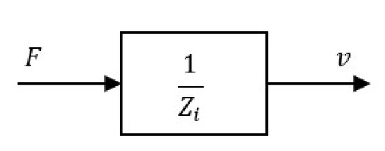 Figure 7b depicts the heave velocity response, v, obtained when the force signal, F, shown in Figure 7a, is applied to the device. Since the input signal is periodic (even though only one period is considered), the force and velocity can be described by their complex quantities in the frequency-domain, denoted as and , respectively. In this way, the block diagram in Figure 3 and Equation (9) show that the intrinsic impedance can be obtained as: