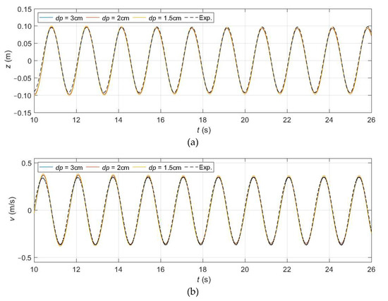Numerical and experimental time series of the heave position (a) and velocity (b) for three values of dp.