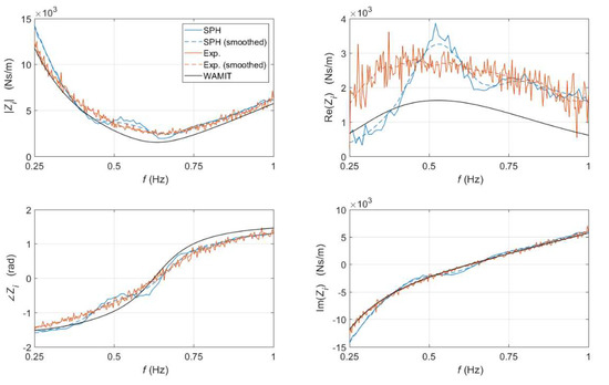 Figure 8 depicts the magnitude (top left), phase (bottom left), real part (top right) and imaginary part (bottom right) of the intrinsic impedance in the frequency domain. The results of the DualSPHysics simulation (in blue) are compared with the experimental ones (in orange) [61] and with the ones calculated using the potential-flow method WAMIT (in black). Both signals, the experimental and SPH one, have some noise; this noise being more relevant in the latter due to the lower frequency resolution employed, as previously explained. To avoid this undesirable but inevitable effect, a second order Savitzky-Golay filter is used to smooth the SPH and experimental results (dashed lines in Figure 8). Leaving aside the plot of Re(Zi), Figure 8 demonstrates a high level of agreement between the SPH, experimental and WAMIT results. The resonance frequency, obtained as the frequency at which the imaginary part (or, equivalently, the phase) of the intrinsic impedance crosses the x-axis, is around 0.65 Hz for all cases. Regarding the plot of the real part of Zi shown in Figure 8, the difference between the experimental and WAMIT curves is roughly constant with frequency, revealing an offset caused by the fact that WAMIT is neglecting the viscous effects, which have a significant impact on Re(Zi), as shown in Equation (12). This mismatch was investigated in depth in [61]. The real part of the intrinsic impedance obtained with SPH nicely matches the experimental data at high frequencies; however, when low frequencies are considered, Re(Zi) is highly underestimated. This means that when the frequency is high enough, the SPH simulation is able to reproduce the physics of the problem correctly, but when the frequency is low, there is a phenomenon, most likely related with viscosity, that is not being adequately captured.