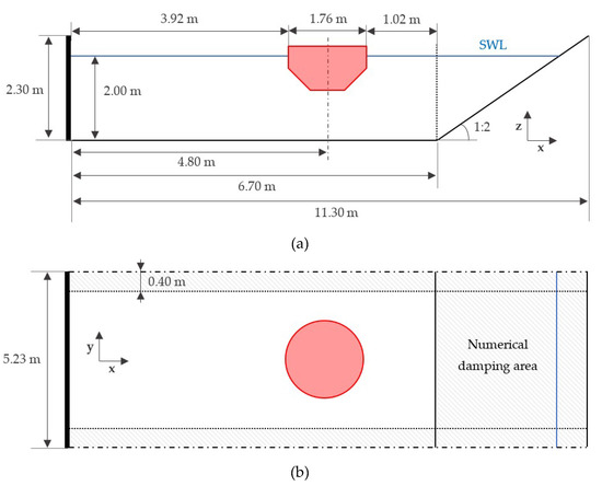 The numerical domain employed in the simulations is common for the two aforementioned cases since the wave conditions are very similar. A detailed diagram of the top and lateral views of the numerical domain is shown in Figure 9. Although the numerical tank is very different from the experimental basin to reduce the computational runtime, it has been carefully designed such that the wave conditions acting on the device are the same. The reduction in the water depth from 6.10 m to 2.00 m is such that the deep-water condition present in the experimental campaign is conserved and, therefore, the wavelength remains constant. The correct wave propagation is guaranteed by placing the device one wavelength away from the wavemaker (considering the case with longer waves). The wavemaker consists of 17 independent pistons, each one equipped with an active wave absorption system [59] that absorbs the waves radiated by the device, guaranteeing an adequate wave generation throughout the entire simulation. To avoid lateral reflection, the width of the numerical domain is set to 5.23 m (roughly three times the buoy diameter). In addition, periodic boundary conditions are also applied in the lateral limits, and the numerical damping mechanism described in Section 4 is used in the 0.40-m wide zones closer to the lateral boundaries (to damp the transversal velocities). Finally, a 1:2 steep beach together with numerical damping (to damp the longitudinal velocities) prevents any possible reflection downstream of the device. The overall absorption capabilities of the beach and numerical damping used together here are above 96% for both wave conditions, which means that over 96% of the incident wave energy is being dissipated.
