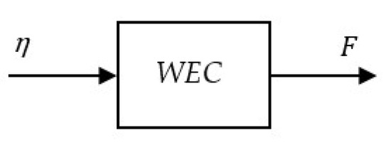 The physical test Case004 from the MASK1 campaign [55] is replicated here numerically using the DualSPHysics code. It consists of obtaining the forces exerted by regular waves of height H = 0.09 m and period T = 1.54 s (which corresponds to L = 3.70 m) on a fixed WEC. Denoting the free-surface elevation with η, its block diagram is shown in Figure 10.