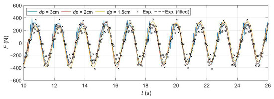 Figure 11 shows the experimental and numerical time series of the vertical force acting on the buoy for three different resolutions, namely dp = 3.0, 2.0 and 1.5 cm. In this figure, the exact instantaneous values of the experimental force are depicted with black crosses while the corresponding fitted curve, generated using a fourth order Savitzky-Golay function, is represented by a black dashed line. As expected, the obtained responses, both numerical and experimentally, are sinusoidal and their periods are equal to the wave period. The figure shows, qualitatively, that the results obtained with any of the resolutions employed provide a good matching, in terms of amplitude and phase, with the experimental curve. Note, nevertheless, that the force output obtained with dp = 3.0 cm presents an important amount of noise during its peaks, while finer resolutions do not. The index of agreement, d1, defined in Equation (10) is used here as a quantitive measure of the total error in each case. Its values, shown in Table 3, certify the good matching observed in Figure 11, as well as the fact that the accuracy slightly improves when decreasing dp. Table 3 also includes the runtimes of the execution of 26 s of physical time using the same GPU card indicated before.