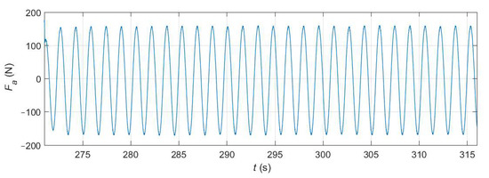 To search the space of controller gains for the optimal tuning around a predicted value, the proportional and integral gains vary every 45 s during the physical experiment. In this section, however, a time window where the gains remain constant is selected from the physical experiment [57]. In particular, t ∈ (271,316) is considered, where the actuator force (shown in Figure 13) is defined by kPTO = 3527 N/m and bPTO = −1754 Ns/m. The wave conditions remain constant throughout the entire experiment: regular waves of height H = 0.11 m and period T = 1.58 s, which qualifies as a deep-water wave with a wavelength of L = 3.90 m. Figure 13 shows that, as expected, the frequency of the actuator force is coincident with the wave frequency and that, after the transient observed during the first period, its amplitude is approximately constant around 160 N. This initial transient is avoided in the simulations by considering the time series from t = 273 s.
