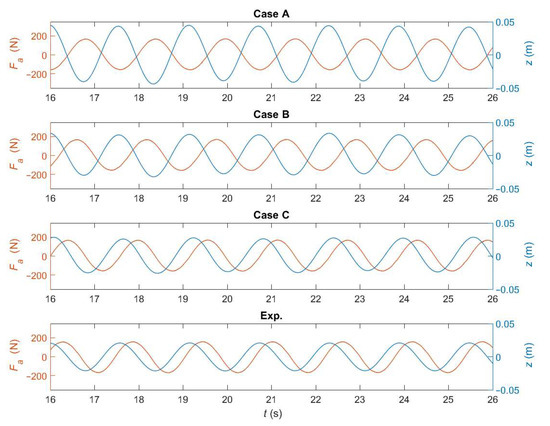 The time series of the experimental actuator force (Figure 13) is applied here to the numerical device as a predefined input signal in DualSPHysics. The WEC’s heave response is the result of the interaction between the externally-imposed actuator force and the action of regular waves. Therefore, the phase between the wave elevation and the actuator force has a very important effect on the results. Even though it is not possible to know with certainty the wave elevation at the WEC location, the heave position z is available and its phase with respect to Fa can be effectively used instead. Three different phases are simulated simply by delaying the time at which the external actuator force is applied in each simulation (cases A, B and C). The actuator force and heave position time series for the three numerical cases are shown, along with the experimental ones, in Figure 14. Regarding the numerical results, the actuator force signal is shifting in phase while the heave position is not, causing a phase difference between them of about π rad in case A, 3π/4 rad in case B, and π/2 rad in case C. The experimental phase between Fa and z, observed in the bottom plot of Figure 14, is very similar to the one obtained with case C, i.e., approximately π/2 rad.