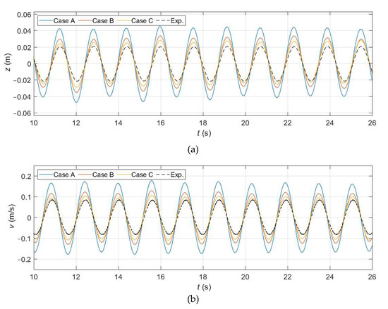 Figure 15 compares the heave position and velocity time series of each numerical case with the experimental results. The three cases overestimate the amplitudes of z and v but, as the phase lag between Fa and z approaches the experimental one (Figure 14), so do the amplitudes of the heave position and velocity. However, the phase difference is not known before running the simulation, thus it becomes a trial-and-error process. This approach, besides being inefficient, is also unrealistic because the actuator force is very rarely given by a predefined signal, but rather by its PTO force.