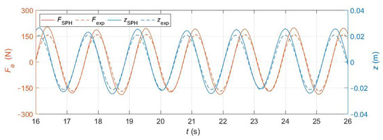 The actuator force is applied to the WEC in the physical experiment [57] by means of a closed-loop system as the reaction of the PTO force. The PTO force depends on the device’s heave response according to the coefficients kPTO and bPTO, as described in Equation (13). Project Chrono allows numerical implementation of this feedback loop simply by setting kPTO = 3527 N/m and bPTO = −1754 Ns/m. Therefore, thanks to the coupling of DualSPHysics with Project Chrono it is possible to simulate the dynamic response test with its corresponding closed-loop system using the numerical tank defined in Figure 9 and the wave conditions previously described (H = 0.11 m and T = 1.58 s).