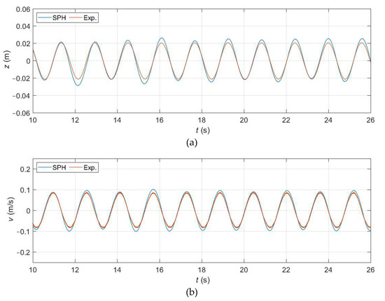 Figure 17 shows the heave position and velocity obtained numerically and experimentally. The matching in terms of phase is nearly perfect, while in terms of amplitude it is slightly overestimated. If the index of agreement (Equation (10)) is used to quantify the error, a value of d1 = 0.92 is obtained for both z and v when using a closed-loop system, which is significantly higher than the one obtained with the most accurate case when using an open-loop system (d1 = 0.74). By comparing results in Figure 17 with the ones in Figure 15, it can be also seen that the amplitude overestimation obtained now with a closed-loop system is lower than in any of the three cases with an open-loop system. Note as well that the amplitude of the heave movement is of approximately 0.02 m, which is the value of the dp used, meaning that small motions can be correctly simulated even with relatively coarse resolutions. Therefore, this numerical simulation satisfactorily reproduces the response of the WEC equipped with a proportional–integral controller.