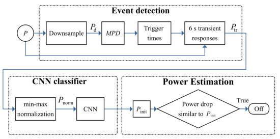 The proposed methodology comprises of three main parts: (a) an event-detection system to find active power changes corresponding to turn-on events, (b) a CNN binary classifier to determine if the turn-on event was caused by a specific target appliance or not, and (c) a power estimation algorithm to calculate in real-time the appliance power per second and consequently the energy consumption. An overview of the system in flowchart form is illustrated in Figure 1.