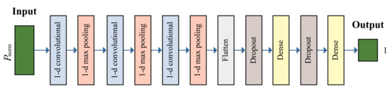 Since the CNN input model is an one-dimensional signal, one-dimensional convolutional layers are used to extract the useful features from Pnorm. In particular, three consecutive 1-d convolutional layers are used in combination with an 1-d max-pooling layer. All convolutional layer parameters have been set to 32 filters, kernel size equal to 3, strides equal to 1, ’same’ padding, and rectified linear unit (ReLU) activation function. The ReLU function is defined as