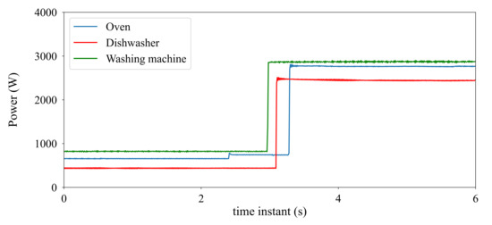 The same principle can detect specific operational states by identifying transient responses caused by a state transition regarding multi-state appliances. For example, for a washing machine or a dishwasher, the water heating process’s transient response can be used to identify this specific state, being of primary interest as the most energy-intensive process during an operation cycle.