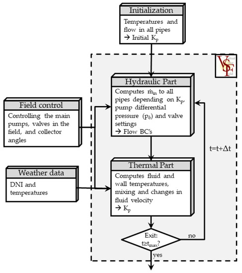 20]. It models the HTF flowing from the power block (PB) through the main distributing header pipes to the subfields and through the solar collector loops then back to the PB through the collecting header pipes. VSF models every single loop and header pipe in the solar field to take the spatial variability of the solar irradiance and different pressure losses in the various components into account. It is based on loosely coupling a hydraulic network solver to compute the flow distribution among the pipes in the field with a transient thermal solver to compute the temperatures with respect to the local thermal and operation conditions, and the thermal losses in the pipes.