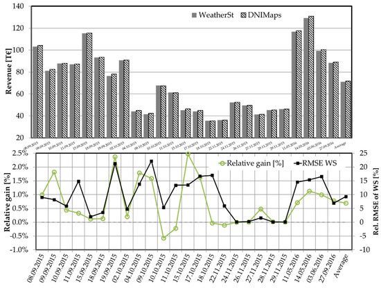 The trend of the revenue gain (green line) follows the trend of the nRMSE of the average value of the two weather station measurements. In