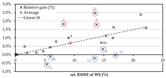 Figure 8, the relation is more clearly observable, where a linear trend can be fitted to the data. In general, the more the measurements deviate from the real situation, the more benefit is gained by using the nowcasting systems. The clear outliers are marked by circles on the figure. The red circles represent the days showing exceptionally higher revenue gains, while the blue ones represent the days with low revenues gains or even some deficit.