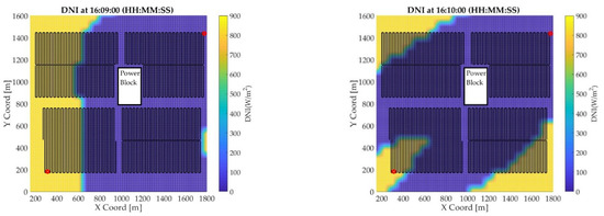 It is important to note that we assumed that DNI maps provide exact prediction of the irradiance falling on the collectors. This means the map values are treated as the real irradiance configuration. At the same time, it is assumed that the controller has access to exactly these data, thus considering a nowcasting system with no measurement errors.