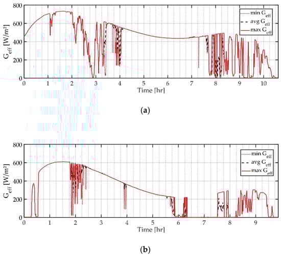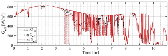 Section 3, such that the input solar irradiance value to the feed-forward part of the controller is the average of two-point measurements extracted from the DNI map. These two points emulate the measurements achievable by the installed weather stations in La Africana. The performance is then compared to the performance of an advanced solar field controller that uses the average value of the whole DNI map falling on the SCAs as input instead. The average, maximum and minimum effective irradiance extracted from a DNI map for an exemplary day are plotted in