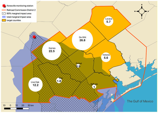 The upwind impact areas overlapped with most of the selected counties for this study, except rarely with Lavaca County toward the east of the monitor. A typical 12-h upwind 90% impact area was of the order of 15,000 square kilometers, similar to the combined sizes of Karnes, Dewitt, Life Oak, Refugio, Bee, Victoria, and Goliad Counties (16,000 km2). The far dominant impact county in all cases was Karnes County, directly upwind of the monitor, with the cumulative permitted, traffic, and upset emissions (22.5 Gg yr−1) representing approximately one-quarter of the calculated emissions.