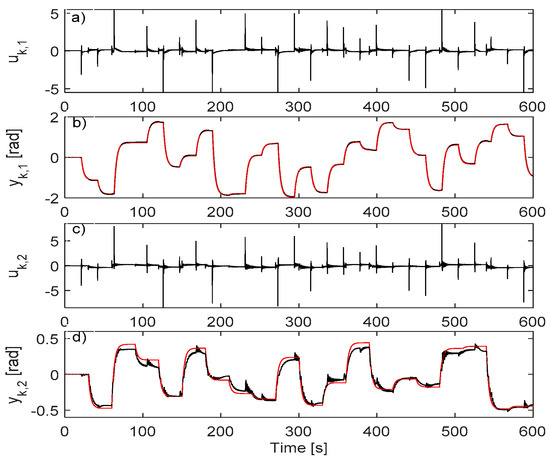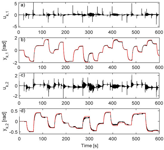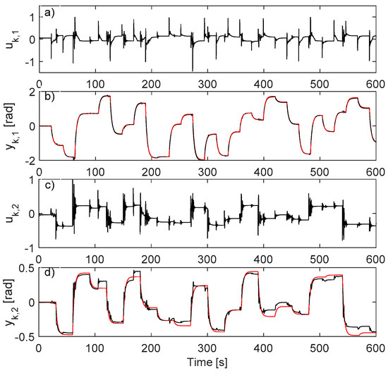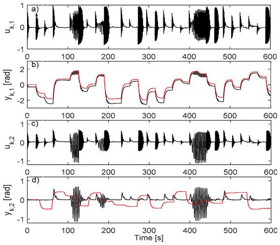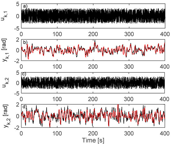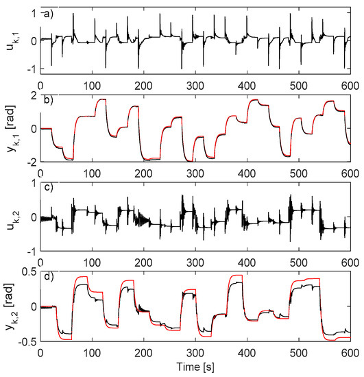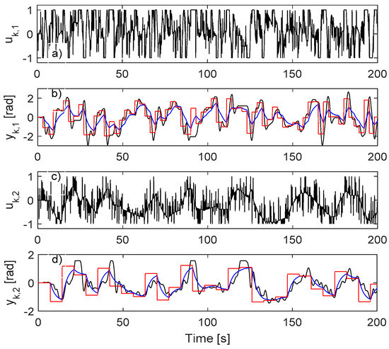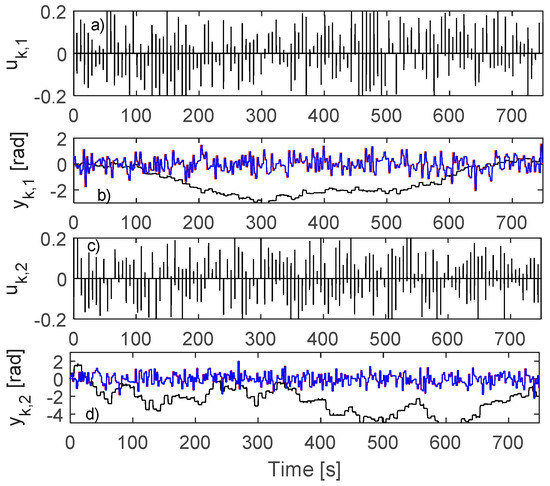 For driving the resulted closed-loop CS, rk,1 is modeled as a sequence of piecewise constant values for 2 s with zero-mean random amplitudes of variance 0.6 and rk,2 is as a sequence of piecewise constant values for 1 s with zero-mean random amplitudes of variance 0.65. For enhanced exploration, random additive disturbance is used on inputs A uniform random number in is added to the first input every 2nd sample and a similar distribution random number is added to the second input every 3rd sample. A total of 15,000 samples of are collected. The collection is shown in Figure 10.