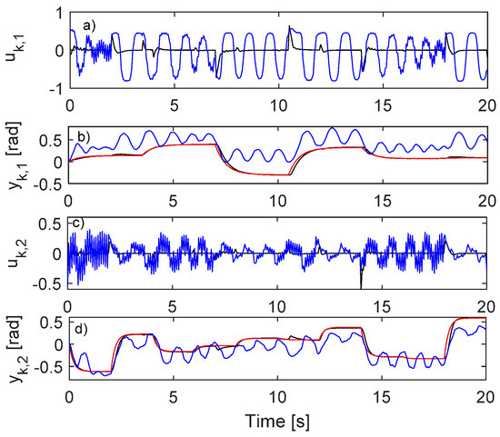 Closed-loop IO data from the process. (a) ; (b) (black), (blue), (red); (c) ; (d) (black), (blue), (red).