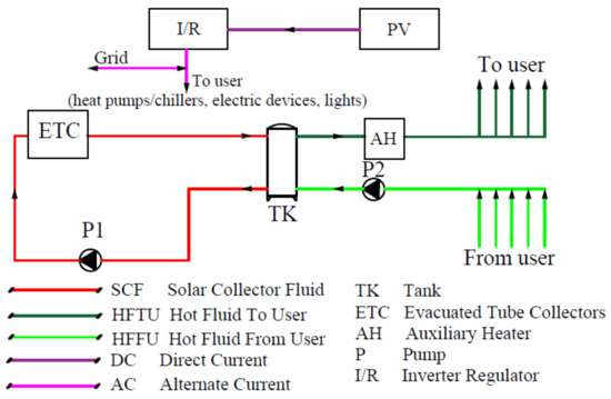 This research proposes an innovative system that includes a district heating network that can provide hot water and space heating; the space heating demand is met by air-to-air heat pumps coupled to a district PV plant. The district heating network is fed by an ETC plant, as shown in Figure 1. Moreover, the PV plant satisfies a share of the electricity demand.