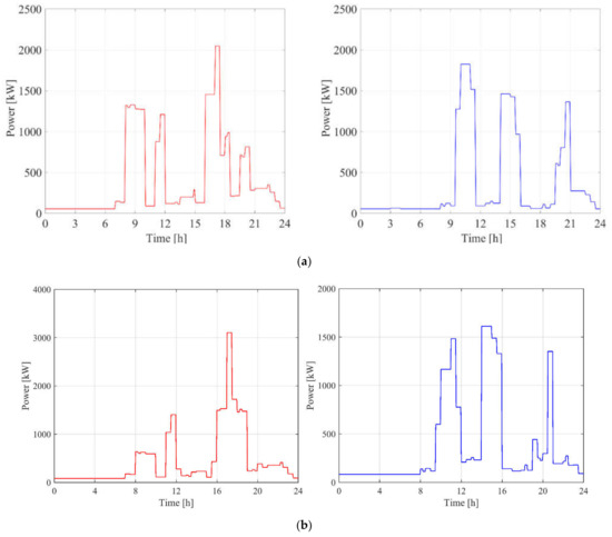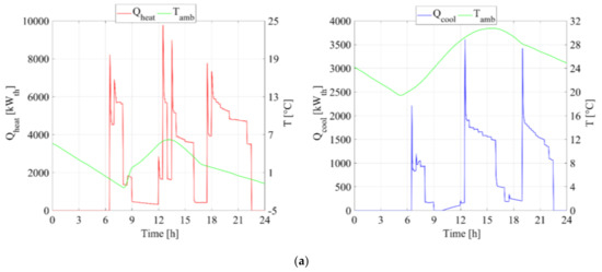 The electric energy demand of the district is formed by: (i) the electrical appliances installed in the buildings, (ii) the lighting equipment and (iii) the space heating and cooling by electric-driven heat pumps for (iv) the hydraulic auxiliary system for domestic hot water provision from the district heating network (DHDWH) (Figure 1).