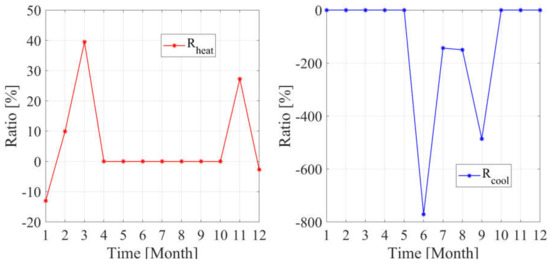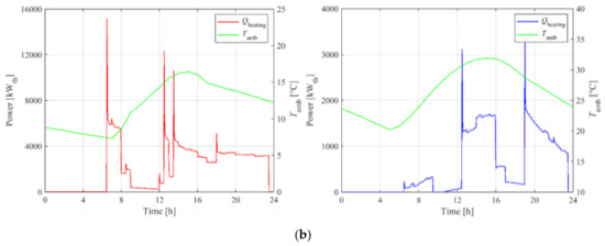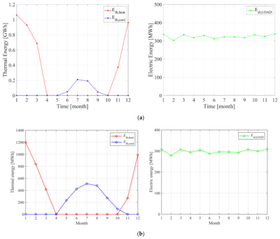 where COPn represents the coefficient of performance of the heat pumps, Eel,LOAD is the total electricity demand, η e l is the efficiency of the conventional power plants (Table 2), η B is the efficiency of the conventional-fired boilers (Table 2) and E t h , h e a t and E t h , c o o l are the annual heating and cooling demand for the heating and cooling of the space.