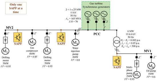 The considered electric power system of an O&G platform is shown in Figure 1, and further described in Section 4. Such an electric grid supplies different load types based on induction motors. The loads M1 to M4 are connected to the MV2 bus (11 kV), while loads M5 and M6 are connected to the MV1 bus (6 kV). The points where the SAPFs are connected are called Points of Connection (PoCs), and the Point of Common Coupling (PCC) is at the output of generators, as shown in Figure 1.