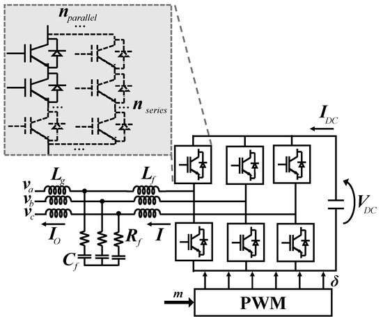 An combination of series and parallel switches is necessary to comply with the requirements of the circuit current and voltage [33]. The number of devices in parallel () and series () for two-level converters is calculated by (1) and (2), respectively. Where is the device datasheet direct current, is the datasheet blocking voltage, and is a voltage safety factor. The must be chosen according to typical values used and values reported in the datasheet. A thermal runaway can happen with too high a repetitive voltage peak, even if this value is below the avalanche break-down limit. Therefore, it is necessary to consider a for the voltage. More details about this procedure can be found on [34].